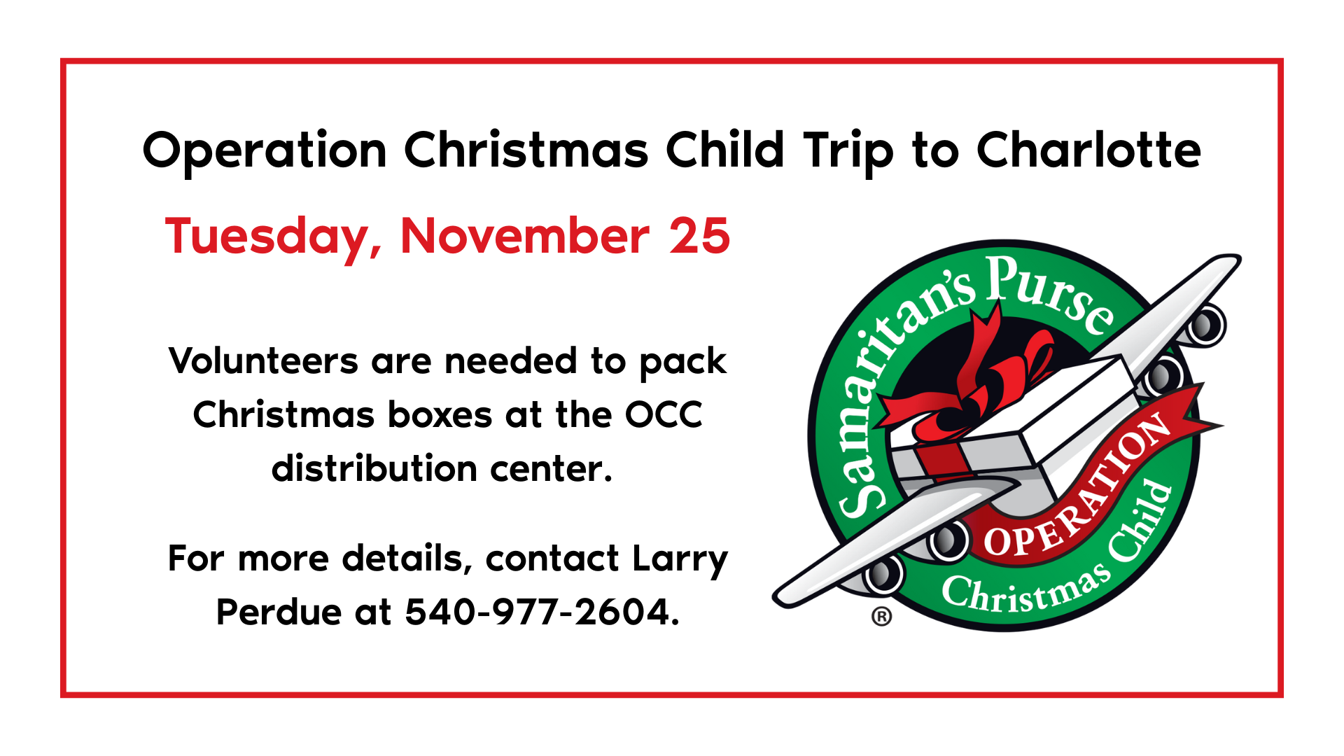 Pick up a box at the Info Center! Every gift-filled shoe box is a tool for evangelism and discipleship for a local church around the world. At Operation Christmas Child outreach events, boys and girls hear the Good News of Jesus Christ and receive a tangible expression of God's love through one of your prayerfully packed shoe boxes. The boxes will be collected November 17-24.