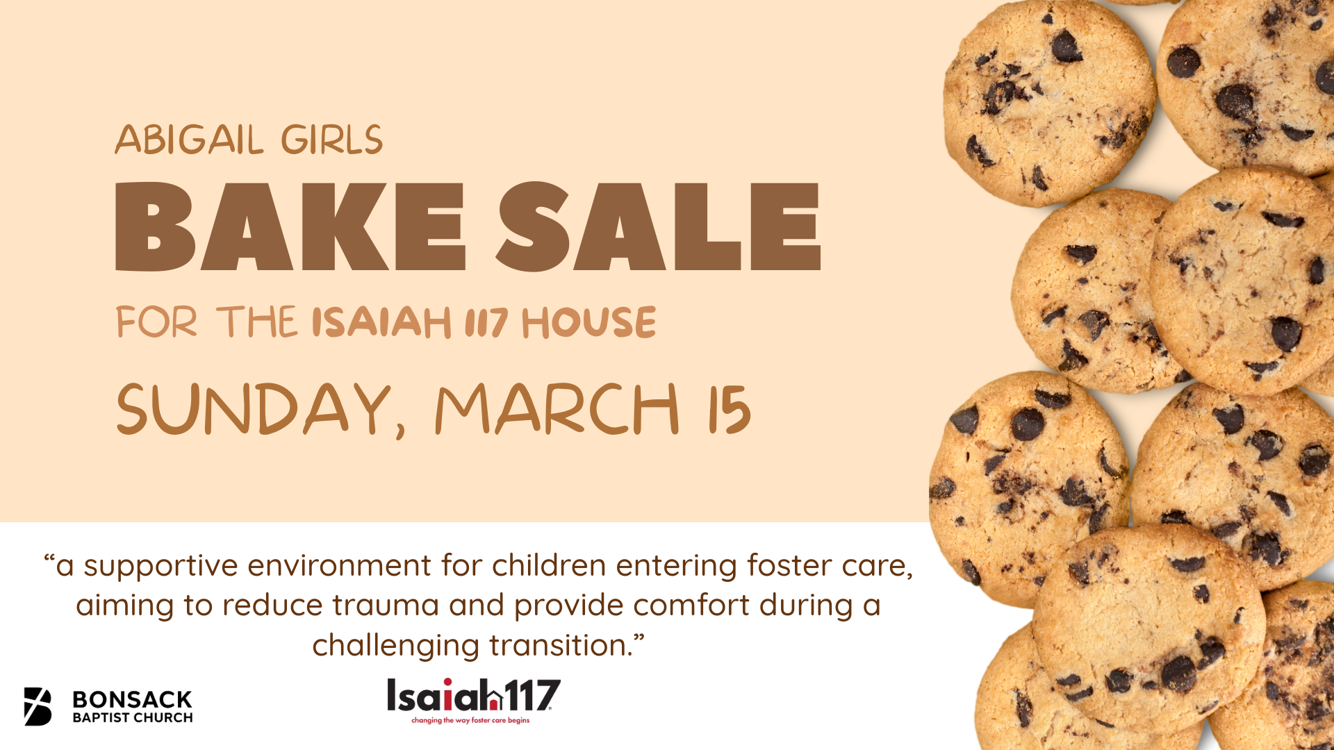 The Abigail Girls are hosting a bake sale to support their mission partner, The Isaiah 117 House, which provides comfort and care for children entering foster care. Stop by for a treat and support their efforts!
