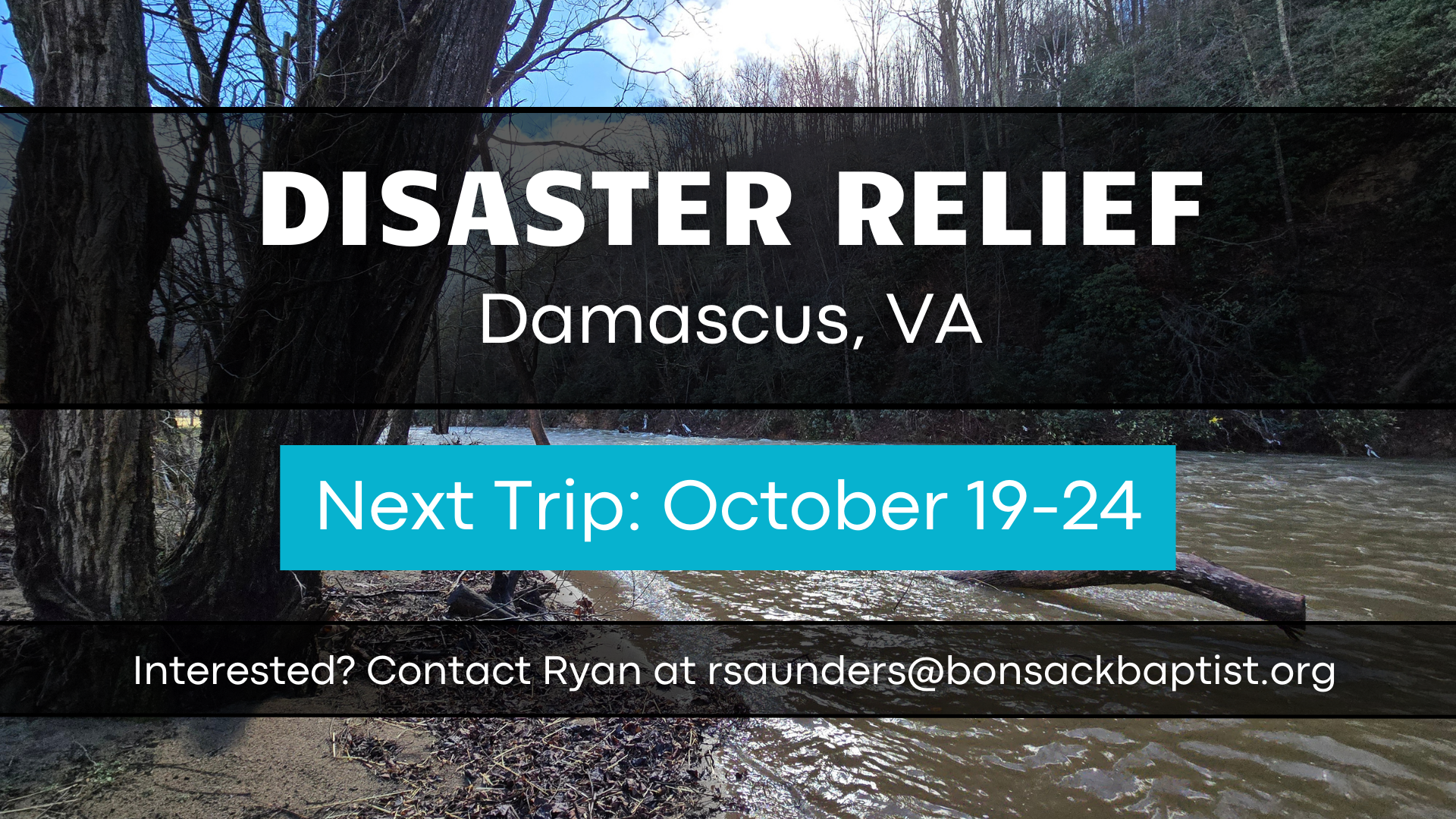 The next disaster relief trip to Damascus VA will be October 19-24. Contact Ryan if interested: rsaunders@bonsackbaptist.org